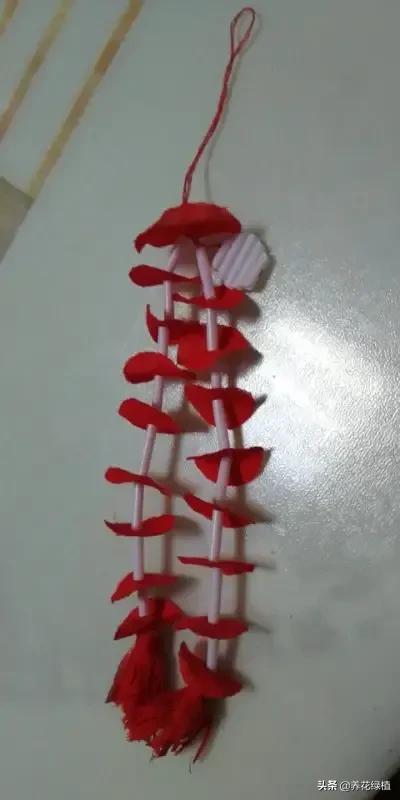 这个比较简单,是给小孩子戴的龙尾。通常,把高梁杆切割成小段,再用花布或者五彩纸,剪出圆圆的纸片。