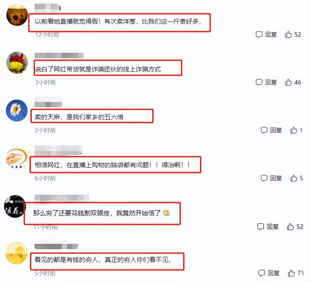 有网友表示,之前看她直播的时候,就觉得特别假,她卖的洋葱比市价贵很多,卖的天麻是原价格的五六倍。身为一个农民主播,却做着商贩赚差价的事,为了赚钱脸都不要了?