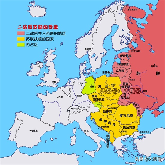 第二次世界大战结束后,苏联实力剧增,成为世界上唯一能与美国抗衡的"超级大国"。在版图拓展方面,苏联新增了54万平方公里土地,并构建了一条与美国对峙的军事分界线,这条分界线从德国吕贝克一直延伸到意大利的里雅斯特。