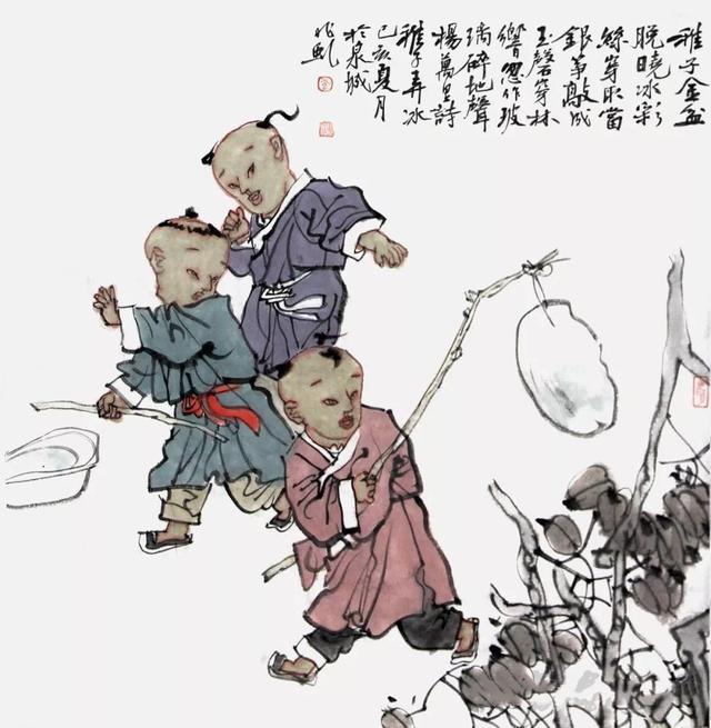 “稚子金盆脱晓冰,彩丝穿取当银铮”,虽是寒冬腊月,但诗中稚子童心炽热,把盆中圆盘一般的冰倒出来,然后穿孔穿线,提在手中当作锣鼓一般敲打。