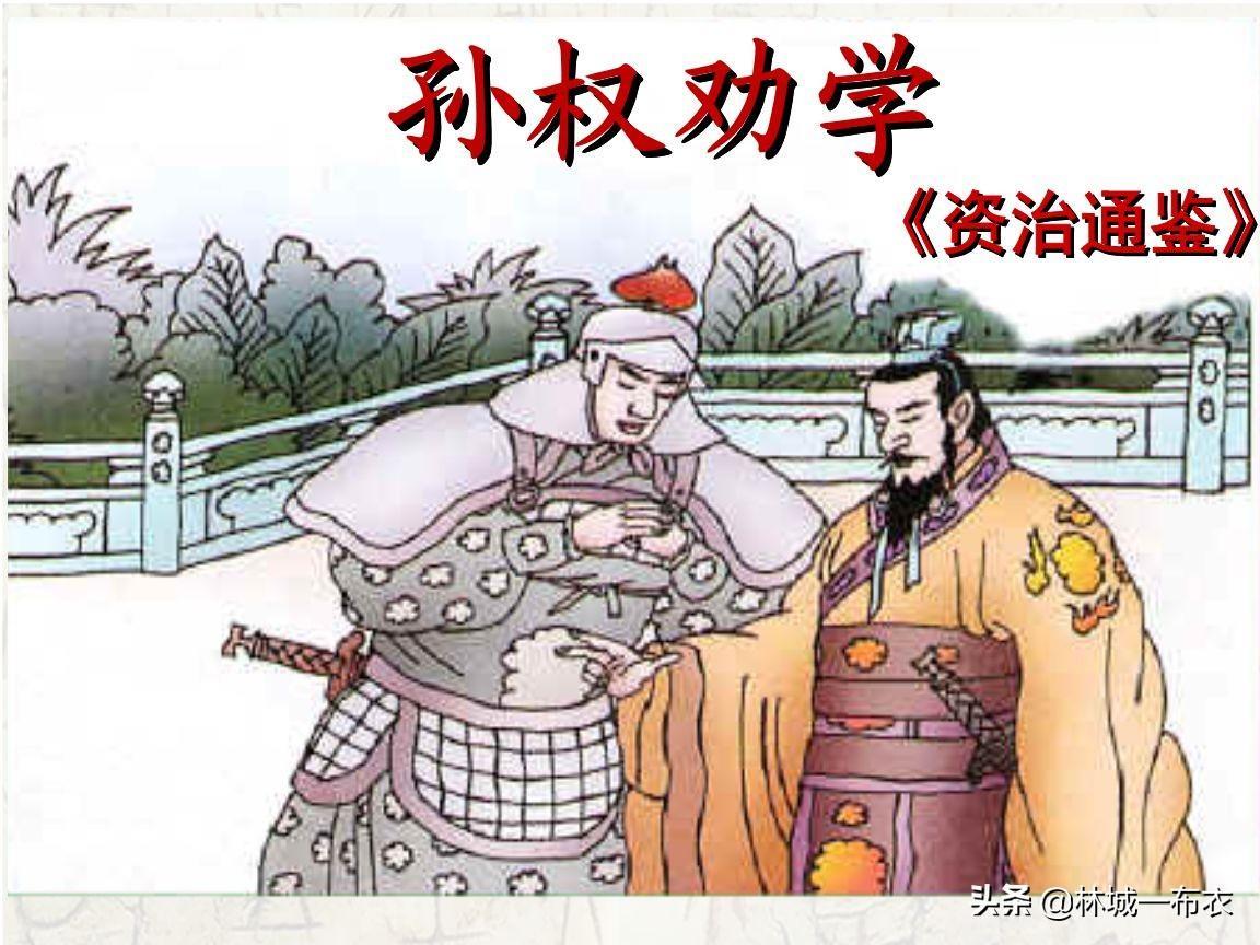 孙权劝学的故事出自北宋司马光编写的《资治通鉴》。说的是:东汉末年东吴的将领吕蒙,最初作为部将,常奉命率兵冲锋陷阵提刀砍人。后来,吕蒙累功升任为独当一面的主将,这需要就不只是敢于冲锋的勇武,还要有掌握战局、战术布置的谋略了。