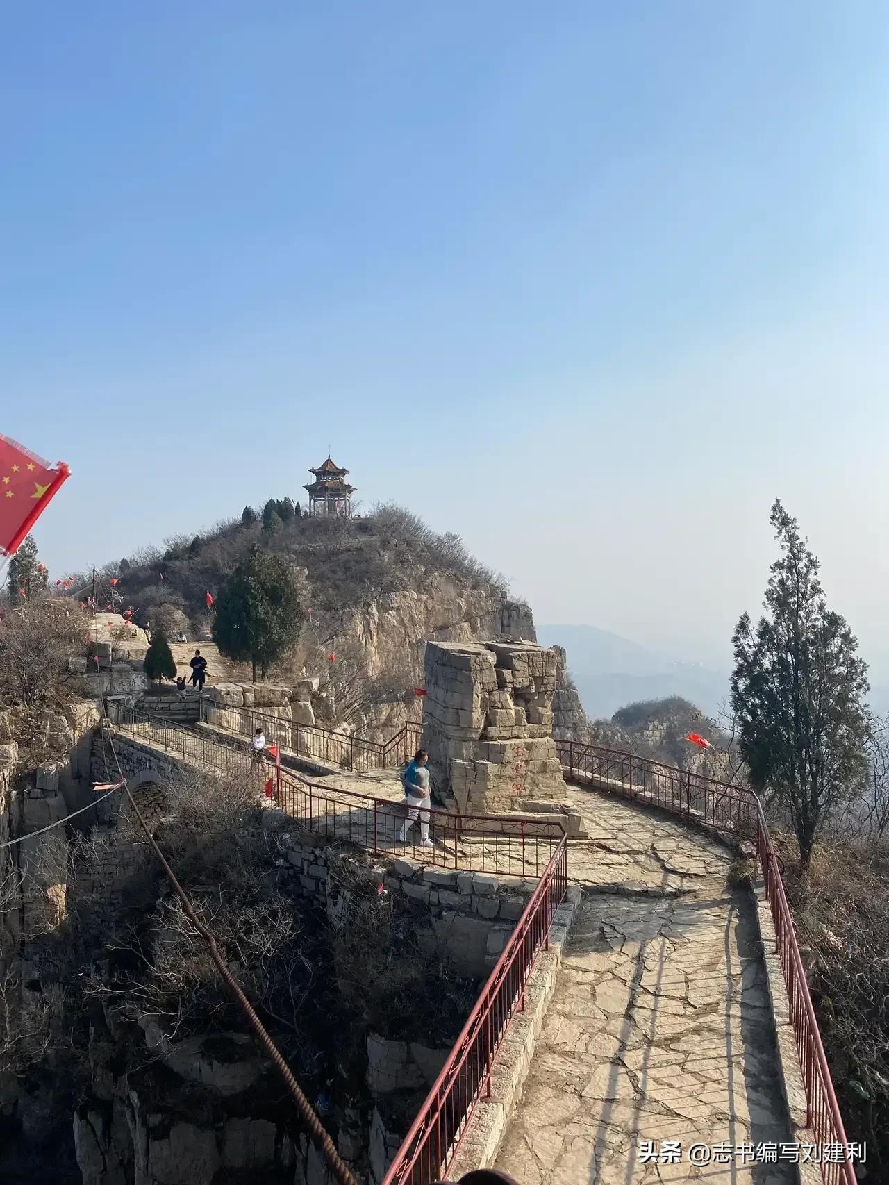 站在挂云山峰顶,天清气朗之时,视野可达百里之外,四周美景尽收眼底。极目东望,是繁华美丽的省会石家庄市和一望无际的华北大平原;西顾为莽莽苍苍似万马奔腾、延绵不断的太行山群峰;向北纵目,是风光旖旎(yǐ nǐ)的中山湖(黄壁庄水库)美景;南朓则是有“天下奇寨”之称的抱犊寨上蜿蜒起伏的长城和宏伟壮观的道观宫殿。早可观日出,午可看云海,晚可观晚霞。