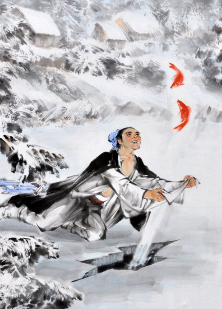 一年冬天,继母朱氏生病想吃新鲜鲤鱼。但当时天寒地冻,河水结冰,无法捕捉鱼。王祥就脱去上衣,赤身躺在冰上,想靠体温暖热融化冰面,以便捕到。等了一会儿,冰化开,从冰洞里跃出两条鲤鱼。王祥非常欣喜,赶紧拿着鱼回家供奉继母。