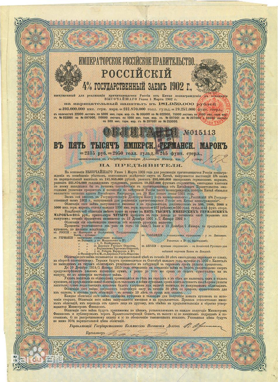 在沙俄财政大臣 С.Ю.维德(1849~1915)的指使和彼得堡国际银行经理 Α.Ю.罗特什钦的主持下,彼得堡和巴黎的10家银行组成财团,与中国驻俄使臣许景澄(1845~1900)于1895年7月6日在俄国首都彼得堡签订了"中俄四厘借款合同"和“声明文件”。