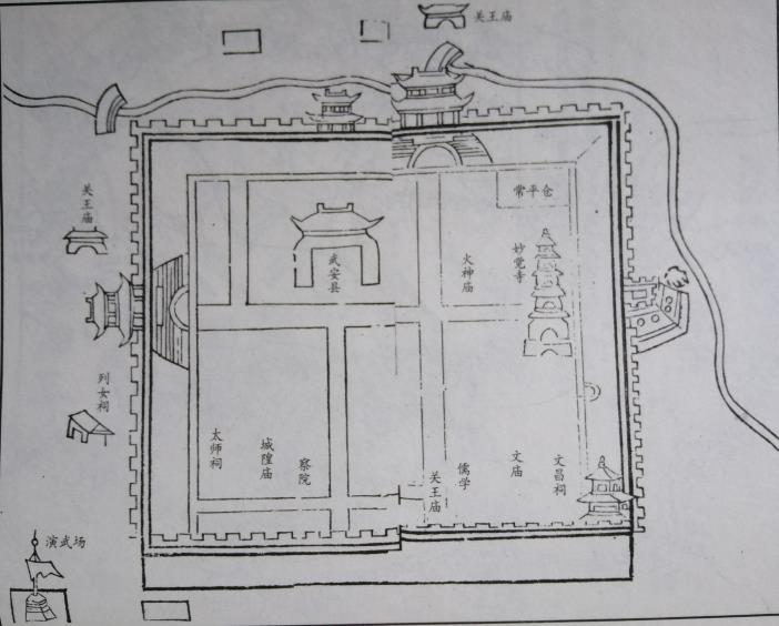 《武安县志》(明嘉靖版)记载:武安县城内城旧传白起所筑,周围三里二百七十步,高一丈八尺(二丈八尺),西、北二门,南、西、北三关厢,东、北面水沟为隍。(注意城池没有东门,向东防御。)