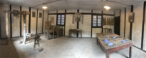 外院是办公室、刑讯室。外院墙上写有“长官看不到、想不到、听不到、做不到的,我们要替长官看到、想到、听到、做到”等标语。渣滓洞有牢房、审讯室、看守所长室,还有审讯台、铁锁链、竹签、辣椒水、老虎凳等酷刑室,“老虎凳”是一个长凳子,再把手脚都捆到凳子上,给脚腕下摞砖头,摞到第三层的时候腿就断了。在白公馆和渣滓洞里,有近三百英烈在这里被杀害。