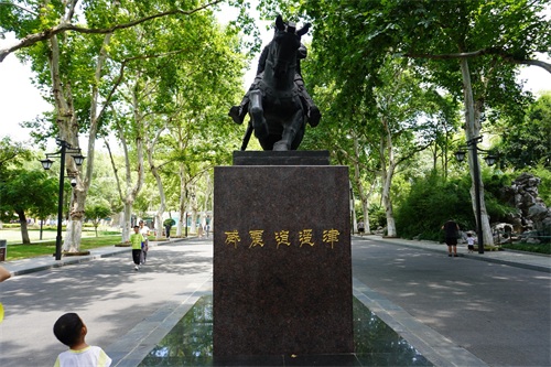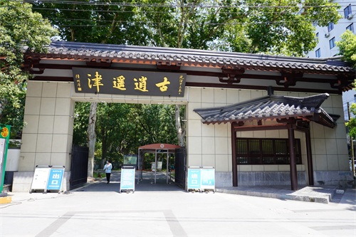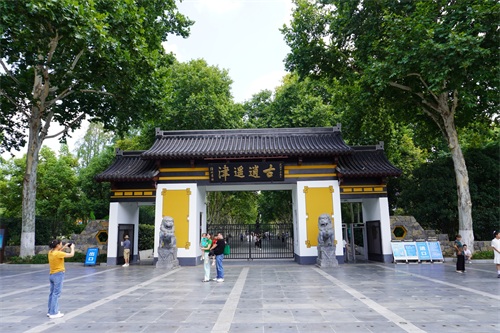 公园西门如同南门,门头牌匾也书有“古逍遥津”四个鎏金大字,但此门比南门规模好像要小一些,这儿的人流也要少许多。