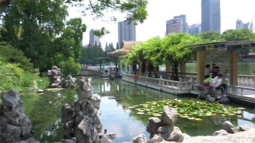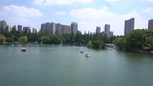 公园分为东西两园,东园的逍遥湖水面开阔宽广,许多人泛舟于湖上,