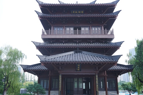 湖边有一高耸建筑:逍遥阁,采用仿古建筑结构、灰黑色仿古门窗,具有汉代的建筑风格,是逍遥津的最高点、从阁顶可俯瞰逍遥津全貌,在阁楼第二层有庄子著名的《逍遥游》。