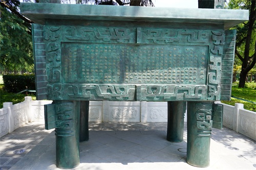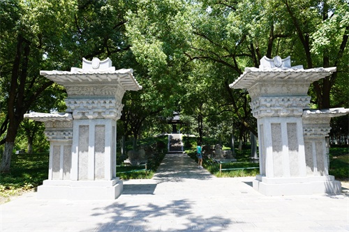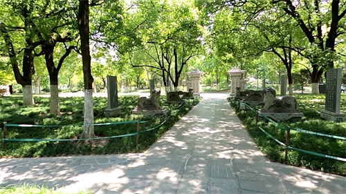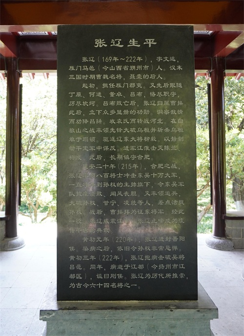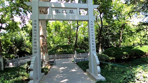 从三国历史文化馆向西行便来到东汉魏国大将张辽墓冢,入口处有二尊具汉代风格的门阙,一条青石板路直达墓地,路两边有成对的狮、虎、羊石雕,路边植有高大树木、绿树成荫。