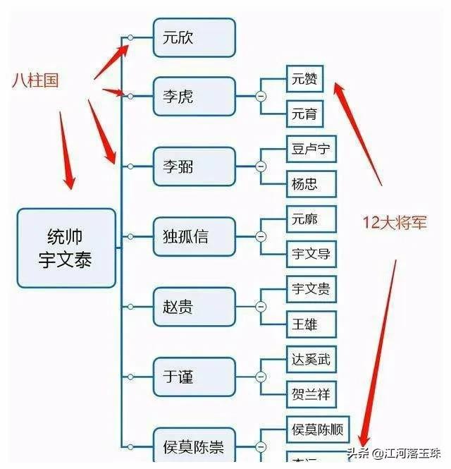 “关陇集团”和现在的股份制公司差不多,董事会成员一共有八个,宇文泰是董事长,其他的七位董事则分别是关陇地区不同世家大族的代表,他们也被并称为“八大柱国大将军”,这其中就包括了唐高祖李渊的爷爷——李虎,以及隋文帝杨坚的老丈人——独孤信。除了这八位董事会成员以外,关陇集团还有十二位分管公司业务的大将军,宇文董事长把西魏所有的军权分成了十二个部分,每个大将军掌管其中一个部分,而八大柱国董事会则负责管理这十二个大将军