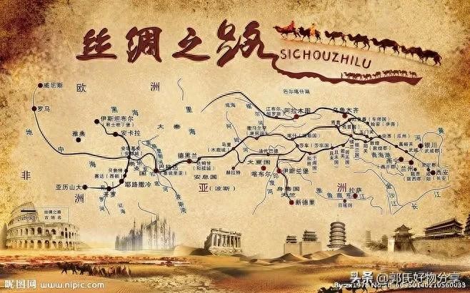 陆上丝绸之路:从中国的长安(今西安)出发,经过甘肃、新疆,穿越中亚,最终到达欧洲。这条路线穿越了多种地形,包括沙漠、高山和草原,沿途的城市如撒马尔罕、布哈拉等成为重要的商贸中心。