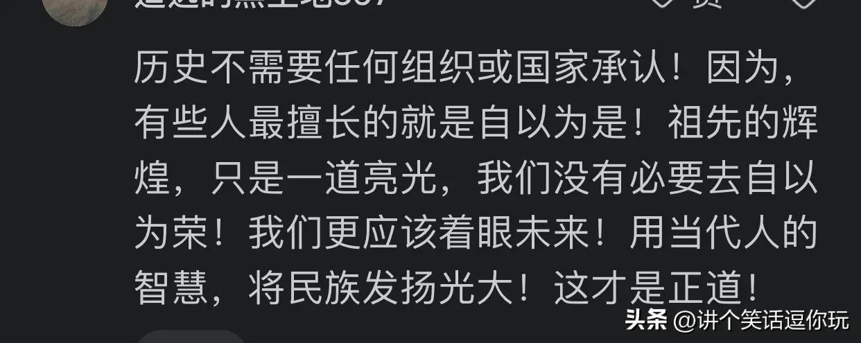 历史不需要任何组织或国家承认!因为,有些人最擅长的就是自以为是!祖先的辉煌,只是一道亮光,我们没有必要去自以为荣!我们更应该着眼未来!用当代人的智慧,将民族发扬光大!这才是正道!