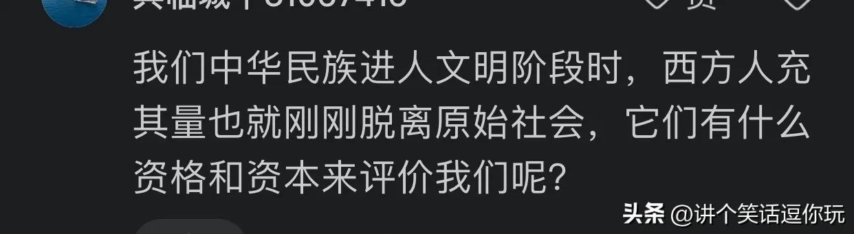 我们中华民族进人文明阶段时,西方人充其量也就刚刚脱离原始社会,它们有什么资格和资本来评价我们呢?
