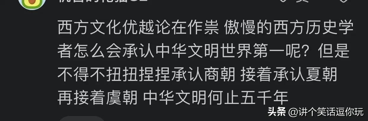 西方文化优越论在作祟傲慢的西方历史学者怎么会承认中华文明世界第一呢?但是不得不扭扭捏捏承认商朝接着承认夏朝再接着虞朝中华文明何止五千年