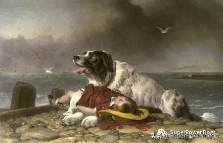 这幅画是英国人埃德温·亨利·兰德尔爵士(1802-73)画于1856年。它结合了维多利亚时代关于童年纯真的观念和高贵动物对人类的奉献。(来自OnzeHond的收藏)在这幅画作中,一只纽芬兰犬趴在码头的岸边,一只从海里获救的女孩躺在它的脚边。