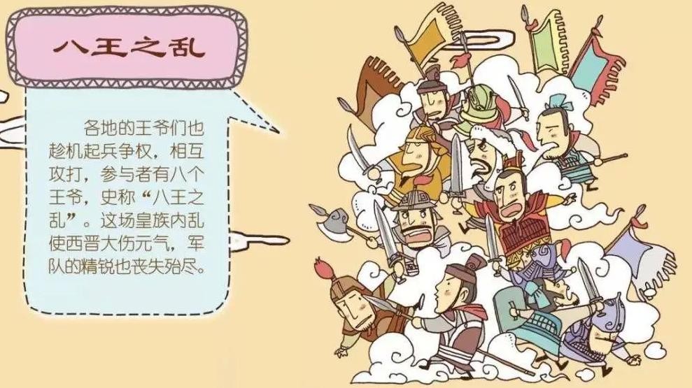 八王之乱:西晋时期一场由晋武帝的八个儿子(司马亮、司马玮、司马允、司马炎、司马攸等)在争夺皇位的过程中引发的内乱,这场内乱持续了十六年之久,导致了西晋的衰落和覆灭。在这场内乱中,各个王子纷纷招兵买马,展开了一场残酷的权力斗争,给社会带来了巨大的破坏和影响。