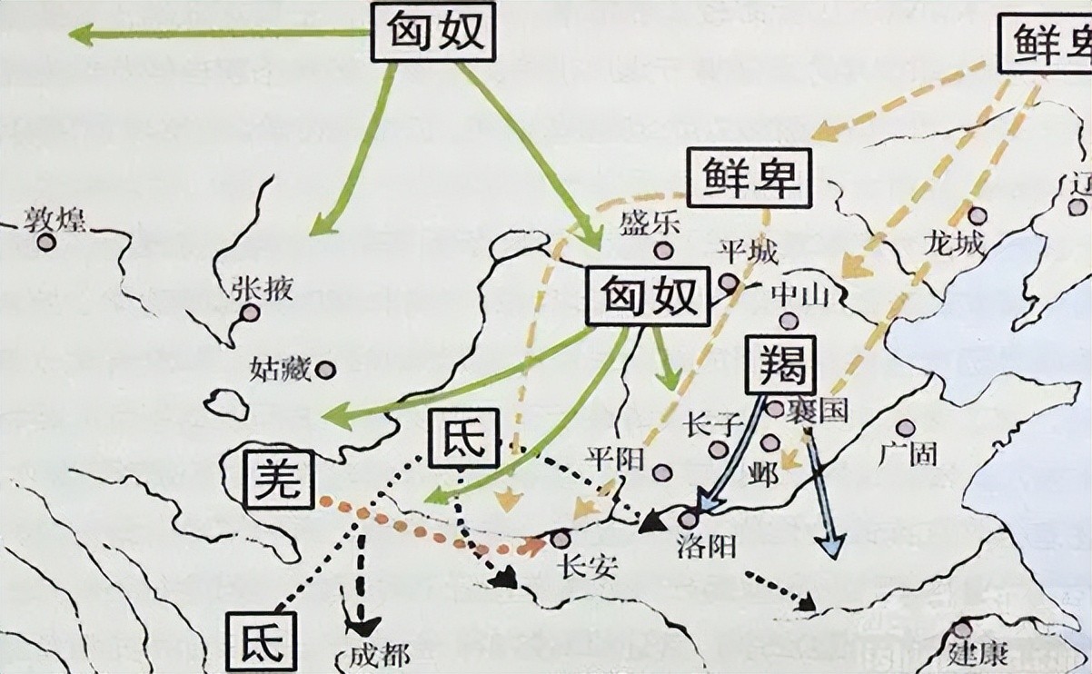 五胡乱华:西晋时期由于西晋的衰落和内乱,一些游牧部落开始趁机入侵中原地区,导致了长期的动荡和分裂。这些游牧部落包括匈奴、鲜卑、羯、氐等民族,他们在中原地区建立了多个政权,给当地人民带来了巨大的痛苦和损失。