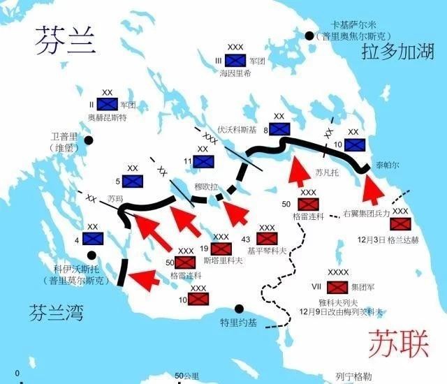 不过却被曼纳海姆防线所阻 ,在这道防线上苏方停滞了达一个月之久。1939年的冬季是欧洲百年来最寒冷的冬季,当时芬兰夜间温度普遍低于35°,这令苏军许多卡车的水箱都冻裂、武器也经常失灵,数百辆坦克是克陷在雪堆之中被芬军烧毁 ,士兵也是深受饥寒,许多人被芬兰游击队击杀在冰雪之中,损失惨重,乃至苏联不得不加大兵力投入,于1940年2月加入了第7和13集团军。