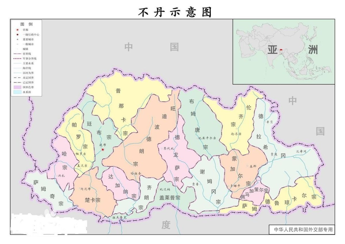 不丹王国地处喜马拉雅山脉东段南麓。不丹西接印度的锡金邦,与尼泊尔相隔,南部与印度的西孟加拉邦和阿萨姆邦接壤。“不丹”一词源于梵文,意为西藏边陲。面积3.8万平方公里,人口74.9 万(2020年)。不丹人(也称菩提亚人)占80%,其余为尼泊尔人。居民多信奉喇嘛教(噶举派)。西部不丹人的“宗卡”语和英语为官方语言。南部操尼泊尔语。首都廷布。