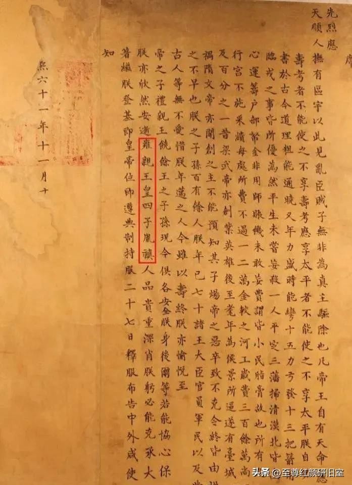 雍正元年八月间,朕于乾清宫召诸王满汉大臣入见,面谕以建储一事,亲书谕旨,加以密封,收藏于乾清宫最高之处,即立弘历为皇太子之旨也。