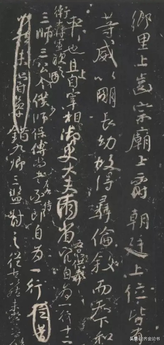 正是有了这样的用笔方式,颜真卿的书法在笔画上就出现了两个很明显的特征,一个是转折的地方采取搭接,鼓起一块,一个是出捺角的地方缺一个角,写成了高跟鞋的状态。