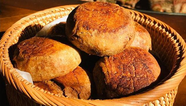 非遗麻酱烧饼其实就是芝麻酱烧饼,主要就是用芝麻酱为馅料制作的,好的芝麻酱烧饼至少有十八层,每一层都有芝麻酱,每层都冒着热气,鼓着肚子,外层带有芝麻仁,切开断层清晰,吃着皮焦脆,内柔软。