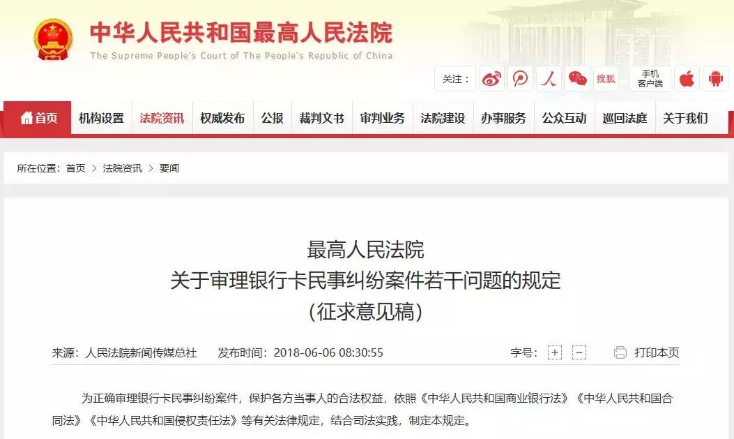 6月6日,最高人民法院在其官方网站公布了《关于审理银行卡民事纠纷案件若干问题的规定(征求意见稿)》,拟对“全额支付利息条款的效力”做出规定,银行的“信用卡全额罚息”行为在司法诉讼中或将被明确限制。