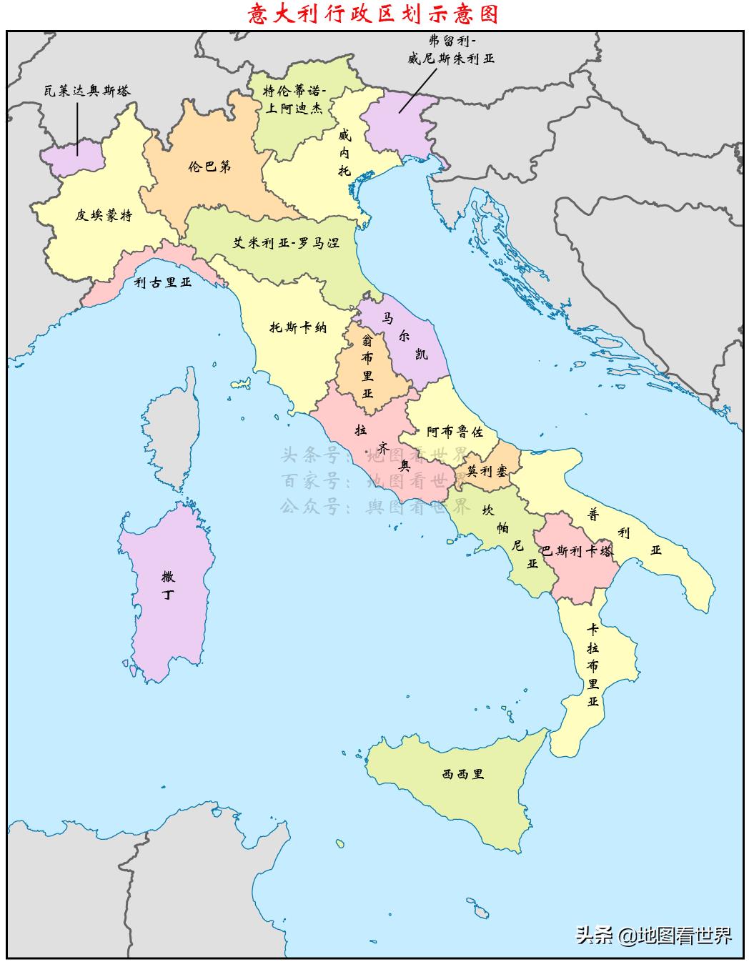 意大利全称意大利共和国(the Republic of Italy),位于南欧,由亚平宁半岛及两个地中海岛屿组成,面积30万平方公里(约为我国四川+重庆面积的一半),行政上划分为20个大区;2020年人口5898万(约为我国四川+重庆人口数量的一半)。