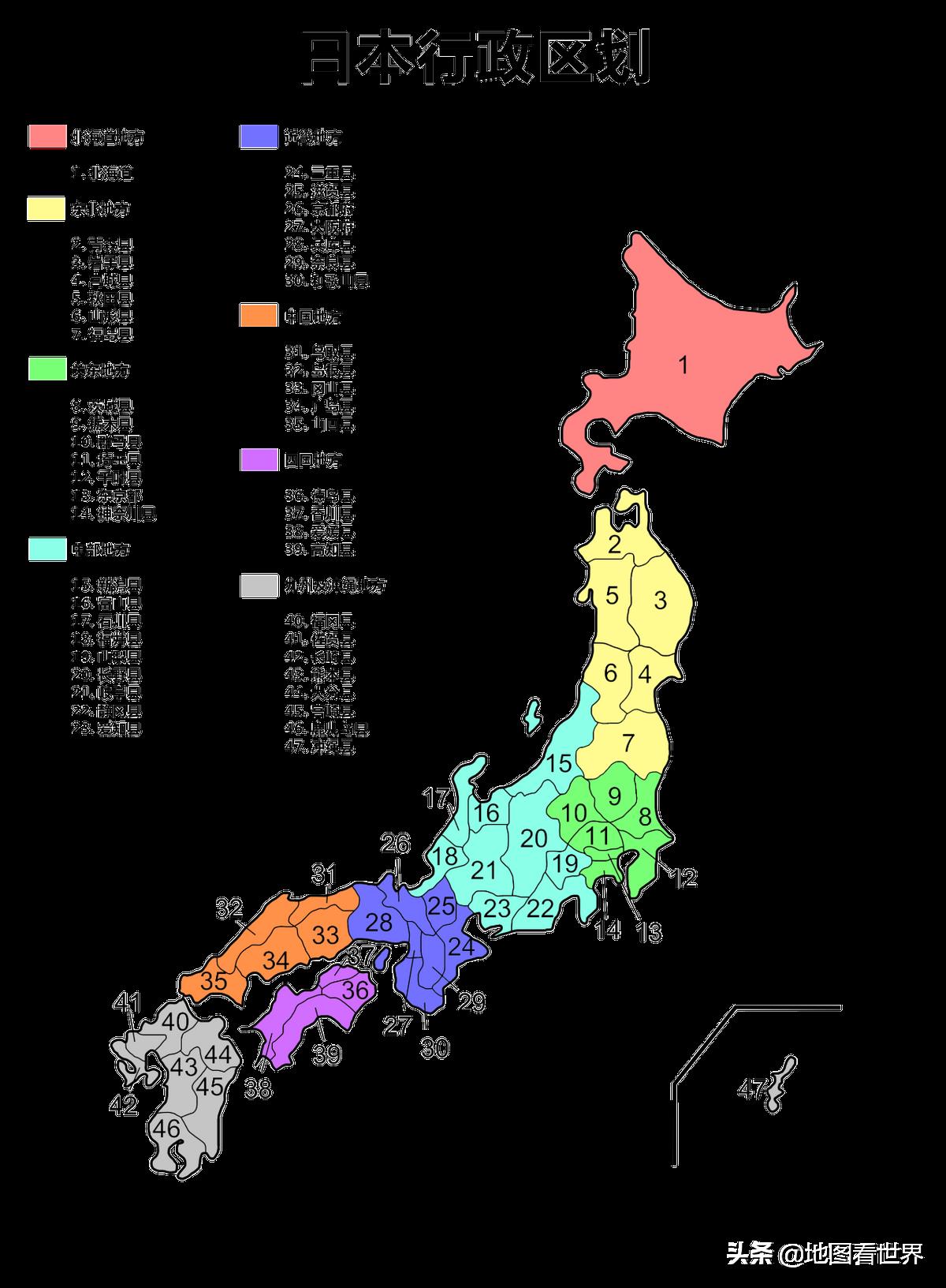 日本(Japan)位于东亚,由本州、四国、九州和北海道4个大岛及6800多个小岛组成,陆地总面积37.8万平方公里(约为我国广东省面积的两倍),行政上划分为47个一级行政区,包括1都、1道、2府、43县。