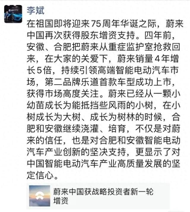 而且李斌也非常感恩,他在获得33亿融资当天,就发了一条朋友圈,提及了4年前蔚来曾命悬一线,是安徽、合肥把蔚来从重症监护室抢救回来,感激之情溢于言表。