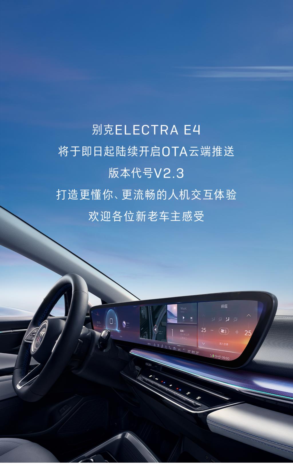 IT 之家 1 月 18 日消息,别克官方今日宣布,别克 E4 即日起陆续开启 OTA 云端推送,版本代号 V2.3。