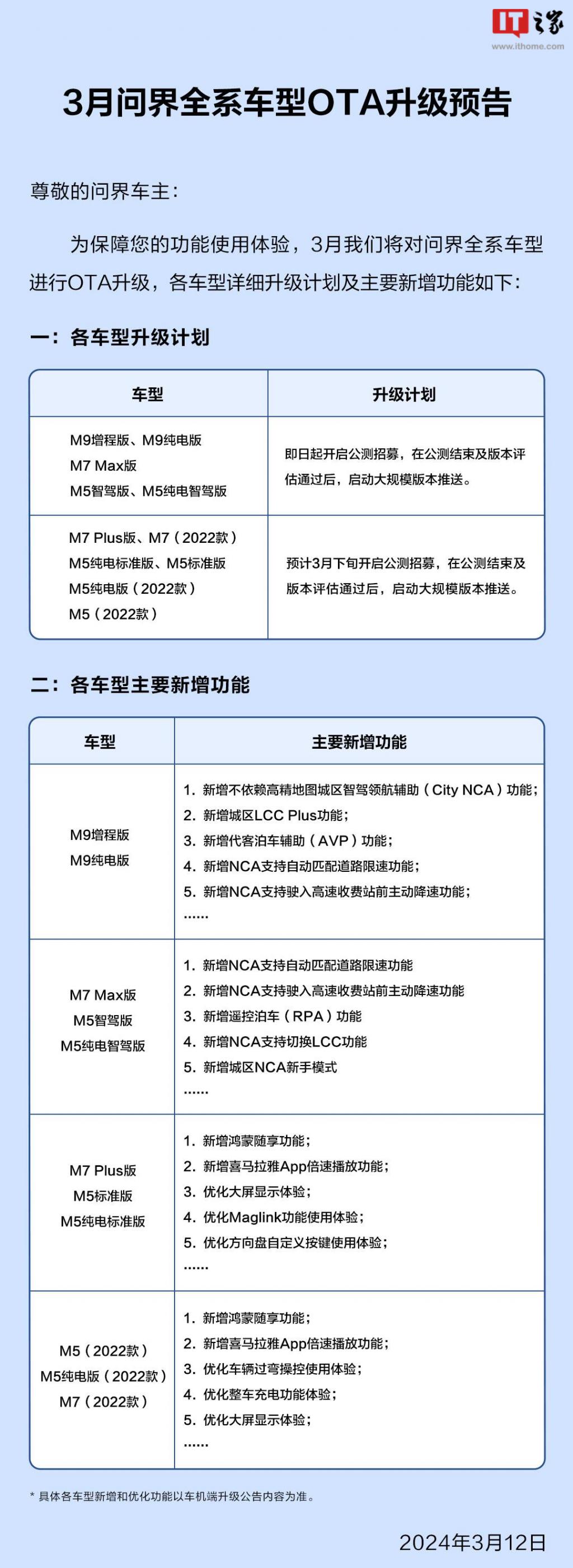 据介绍,本次 OTA 公测覆盖 5 个车型:问界 M5 智驾版、问界 M5 纯电智驾版、问界 M7 Max 版、问界 M9 增程版、问界 M9 纯电版。