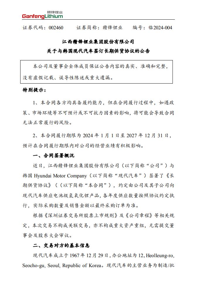 公告显示,本次合同履行期限为 2024 年 1 月 1 日至 2027 年 12 月 31 日。赣锋锂业称,该合同为公司与现代汽车本着互利共赢的态度,在充分考虑现阶段锂市场情况后达成的合作。公司本次与现代汽车签署长期供货协议,既满足了现代汽车对电池生产的关键原材料锂的需求,又有利于提升公司的持续盈利能力,促进公司长远发展。