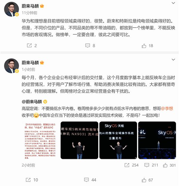此外,蔚来董事长李斌也说道:如果我们做到第一名的时候,我们也不会发周榜。