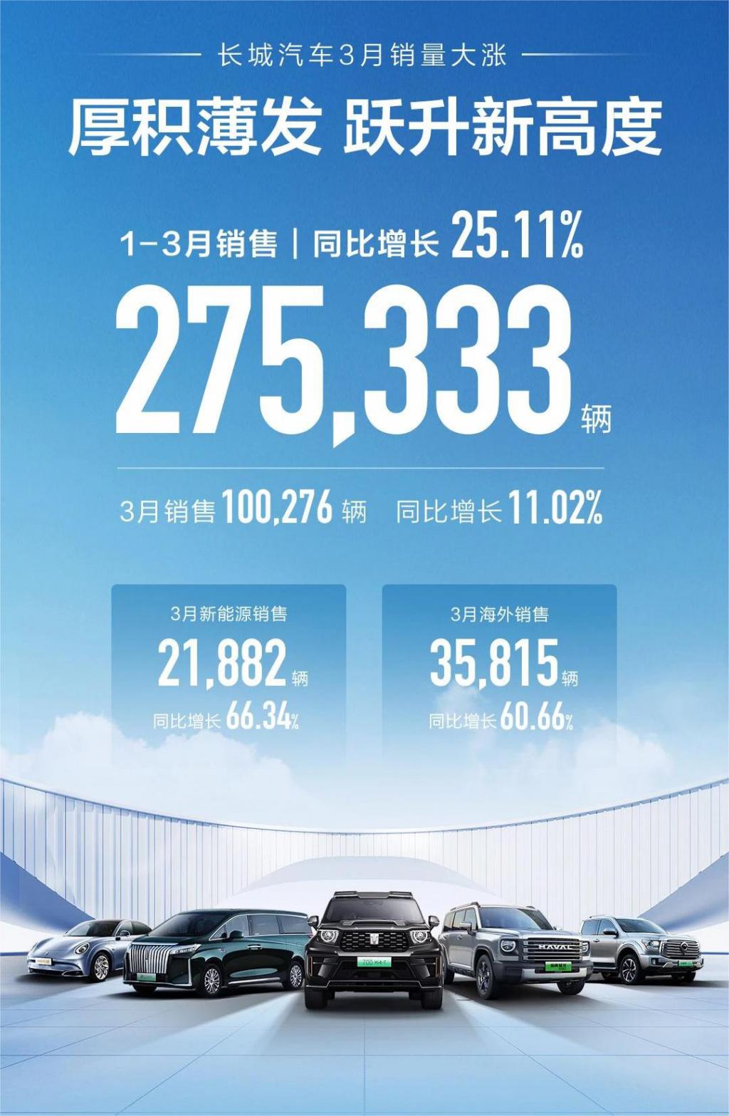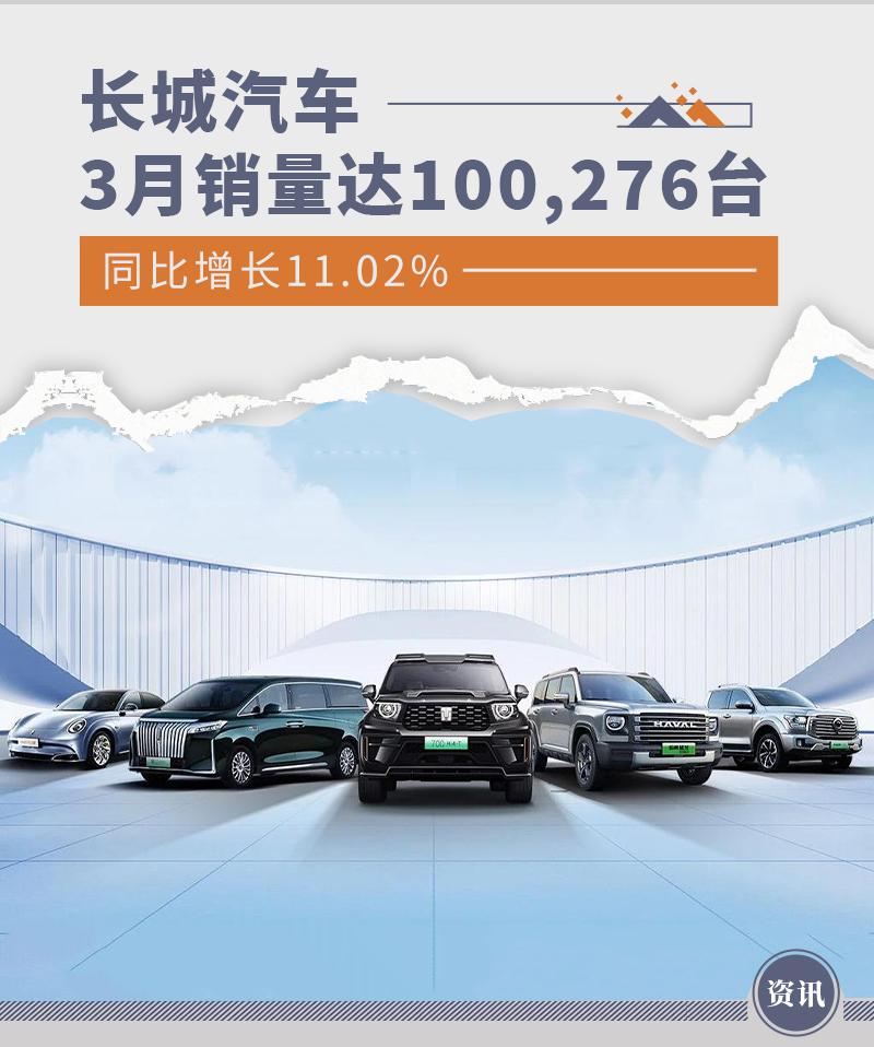 长城汽车3月销量达100,276台 同比增长11.02%