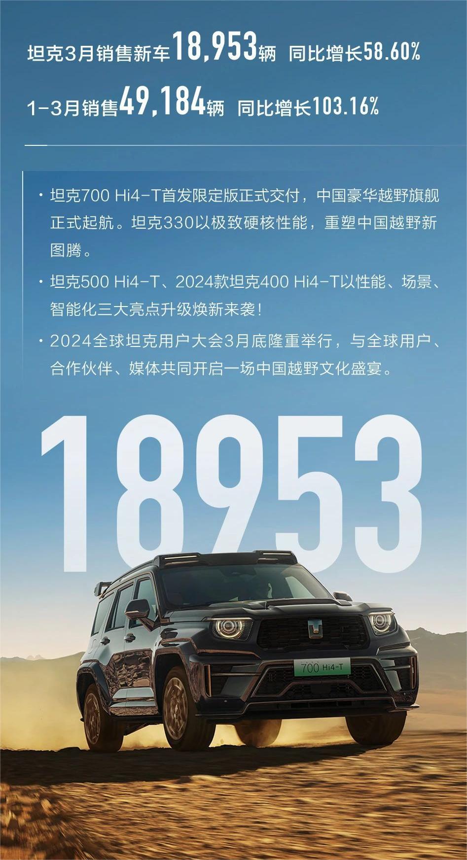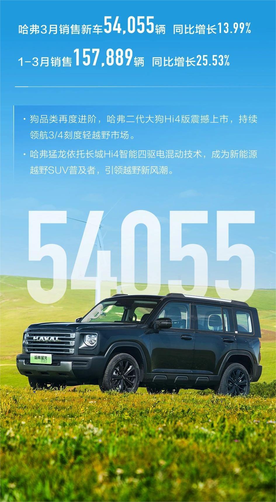 从具体品牌来看,哈弗 3 月销售新车 54,055 台,同比增长 13.99%;1-3 月销售 157,889 台,同比增长 25.53%。魏牌 3 月销售新车 3,608 台,同比增长 182.98%;1-3 月销售 9,608 台,同比增长 182.34%。坦克 3 月销售新车 18,953 台,同比增长 58.60%;1-3 月销售 49,184 台,同比增长 103.16%。