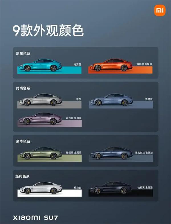 据了解,小米 SU7 提供四大色系共九种选择,分别是: