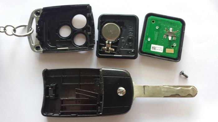 首先,拨动机械钥匙锁,取出机械钥匙。其次,准备螺丝刀,在钥匙的侧边上找到打开的缺口。接着,从缺口处用螺丝刀延着侧边的接缝叩开,能看到钥匙的内芯。然后,找到电池,用螺丝刀把电池挑出来,换个新的电池(安装电池时,注意电池正极朝下;电池型号:CR2032)。最后,按刚才相反的顺序组装好即可。