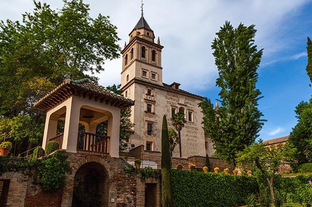 阿尔汗布拉宫又称“红宫”。中世纪摩尔人统治者在西班牙建立的格拉那达王国的宫殿。建于1354-1391年。位于地势险要的山头上。四周围墙用红色石块砌筑。沿墙筑有或高或低方塔,墙内有许多院落,其中狮子院以其轻巧的券廊和雕有十二只狮子簇拥着的喷泉著称。整座宫殿的建筑风格富丽精致,是西班牙最重要、最美丽的伊斯兰教建筑。除城防系统外,主要建筑物是两座长方形宫院及其厅房。其中的狮泉庭院尤为知名,院内中央是12头白色大理石狮子簇拥的盘形喷泉水池,廊庑雕饰极为精美,各厅房也有图案别致的石钟乳状垂饰花纹。