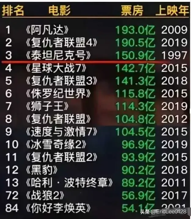 第三名是《泰坦尼克号》,总票房为150.9亿。这部经典的爱情电影,由詹姆斯·卡梅隆执导,讲述了发生在泰坦尼克号号船上的一段永恒的爱情故事。影片的精湛制作和感人至深的情节,让它在影史上留下了不朽的印记。