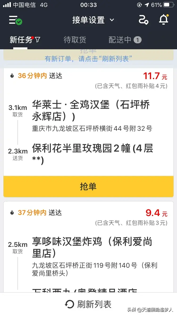 新手最适合跑哪个平台?如果是对周围路径完全不熟悉路痴,建议先跑蜂鸟众包,因为时间稍微长点利于寻找路,被差评也不会扣钱。等到完全熟悉路径后,建议可以两个平台一起跑,只要同一方向时间估计来得及,两个平台的单都可以接单,这样可以多跑点单增加收入,我就是两个平台一起跑。我在天晴的时候,骑电动摩托车一天跑11小时左右,可以跑160块钱到200块钱左右,下雨天有天气补贴要跑得多点。