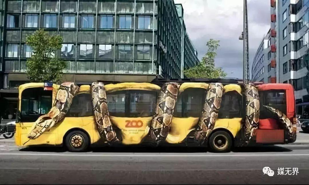 这是动物园的广告,在上面我们能看到大大的”ZOO“字样。让人注意的并不是这个公交车,而是上面的景象。设计师极度逼真的将一条巨型蟒蛇搬到了这个公交车上,这条大蟒蛇吐着舌头,发出兹兹的声音,身体紧紧的捆住公交车,连钢铁制作而成的车体也经受不住这样的力量。