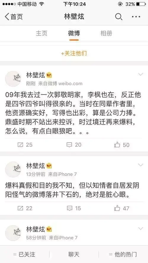 郭敬明旗下作家林壁炫旗帜鲜明地力挺郭敬明,直指李枫白眼狼。