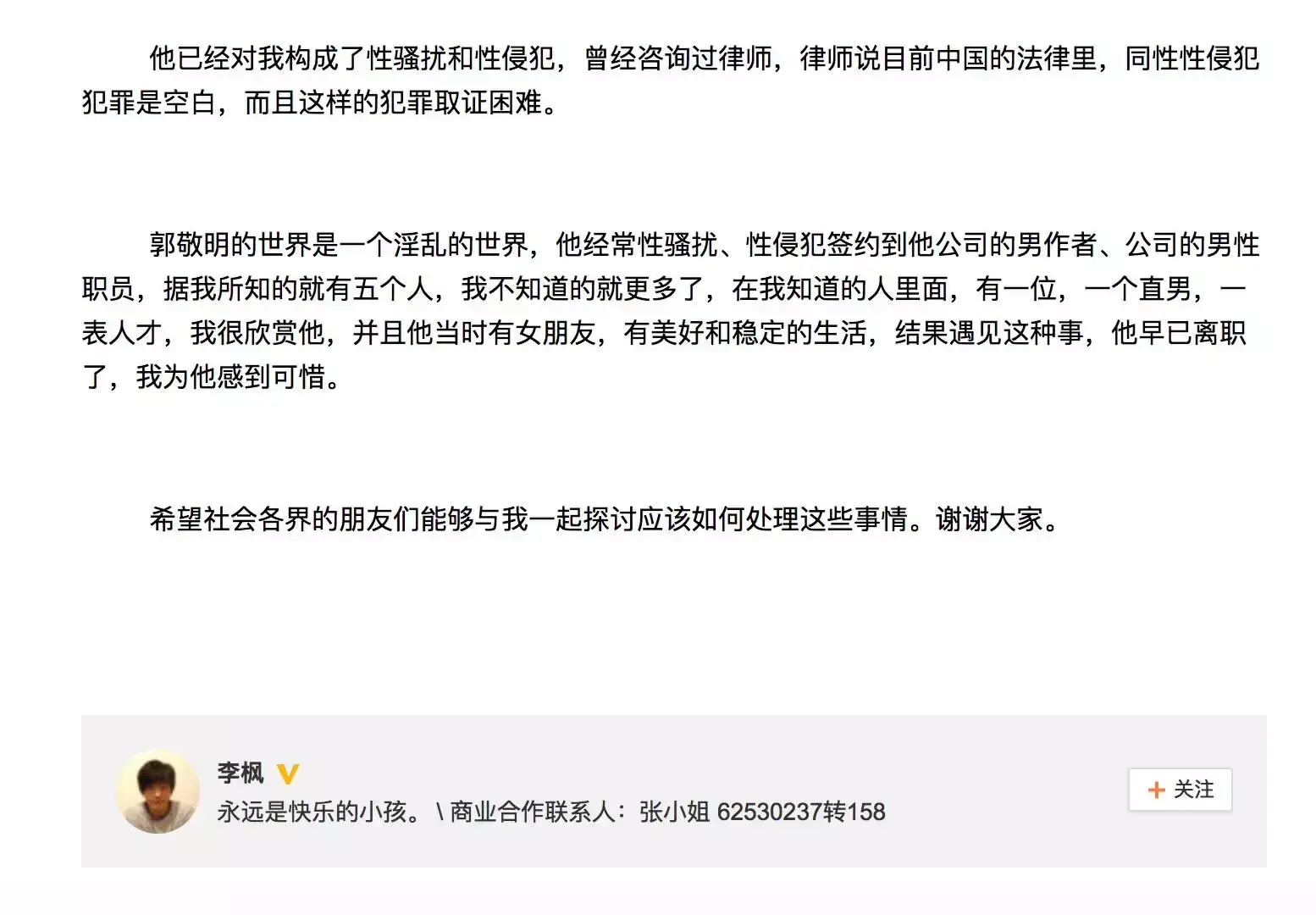 目前在我国,关于男性性侵的法律法规条款尚不明确。因此,李枫此举目的明确——用大众舆论审判郭敬明的“色胆包天”。