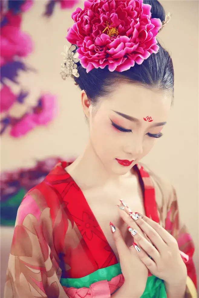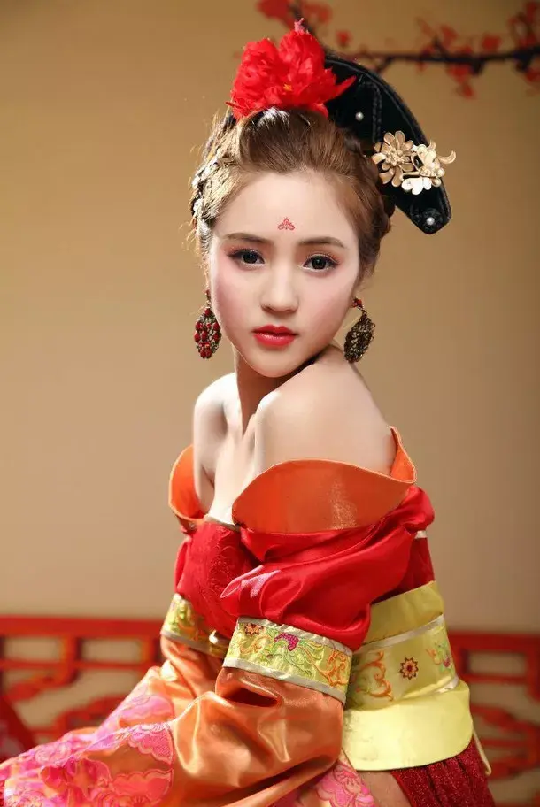 唐妆的妆面:大气,艳丽,以线条为主,颜色以桃红,紫红均可,整体显得妩媚动人即可。粉底:稍白,使脸型丰满,圆润。定妆可稍厚一些。眼部:眼线夸张,眼尾略向上翘,眼影顺眼线斜面延长,重点在眼尾,假睫毛浓密,有的甚至把眉毛延长至鬓角,使人觉得更加妩媚。眉毛:也可上扬,显出一些霸气。最早唐朝时娥眉,初唐时期是"柳叶眉",中唐时期是"八字眉",晚唐时期最有代表性的是"桂叶眉"。唇:以红色为主,画花瓣嘴,用一品红,桃红, 玫红都可以。腮红:可搭配眼影和唇,沿发际线边缘协向晕染。