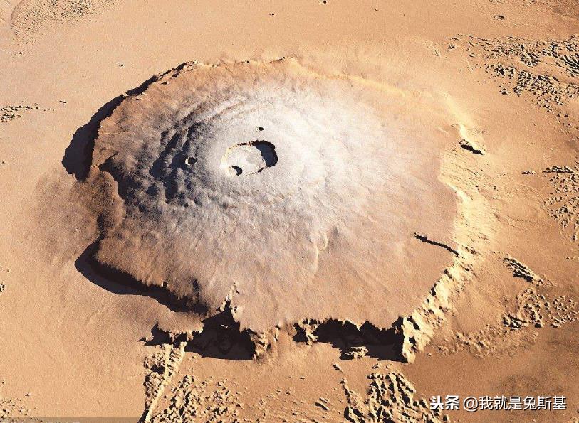 这就是火星上的奥林匹斯山,以希腊神话中的众神之山命名的山峰。奥林匹斯山是一座火山,是火星上的最高山峰。同时它也是太阳系中已知的最高山峰。它有过高呢?我们知道,地球上山峰高度都是以海平面为基本参考线的。火星上没有海洋,因此奥林匹斯山的高度是从山的基座开始算起的。这样算起来都有21229米。整整高出了珠穆朗玛峰12385米!