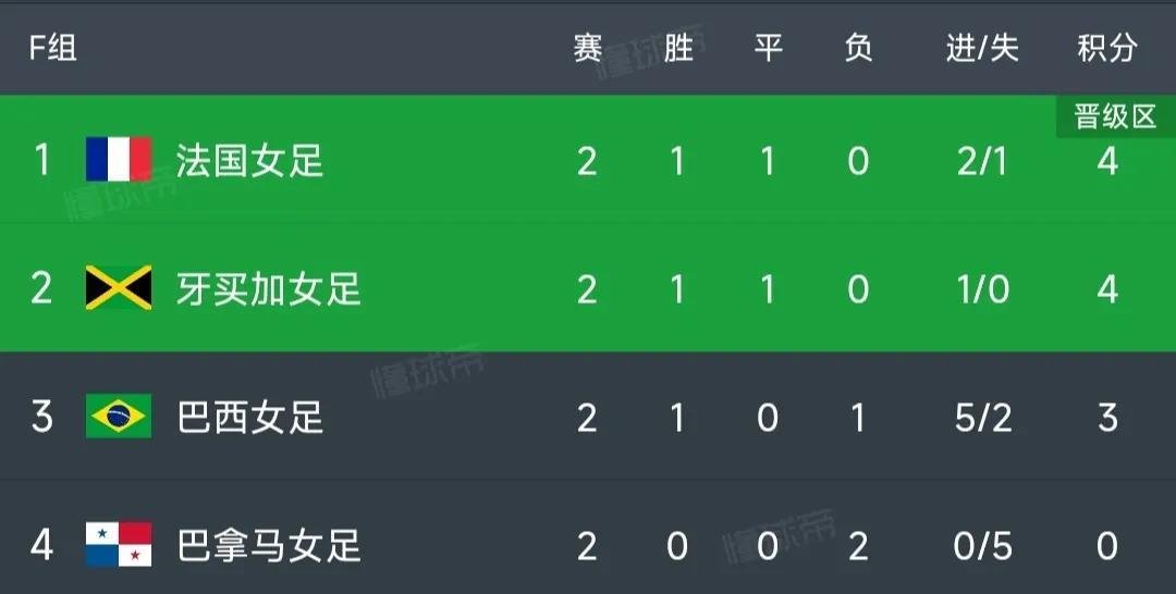 全场比赛结束牙买加女足1-0战胜巴拿马女足收获本届世界杯的首胜,她们也成为本组的搅局者,末轮有机会将法国或者巴西挤出局。这样F组的形势就是法国和牙买加女足1胜1平积4分,巴西女足1胜1负积3分小组第3,巴拿马女足两战全败积0分提前出局。