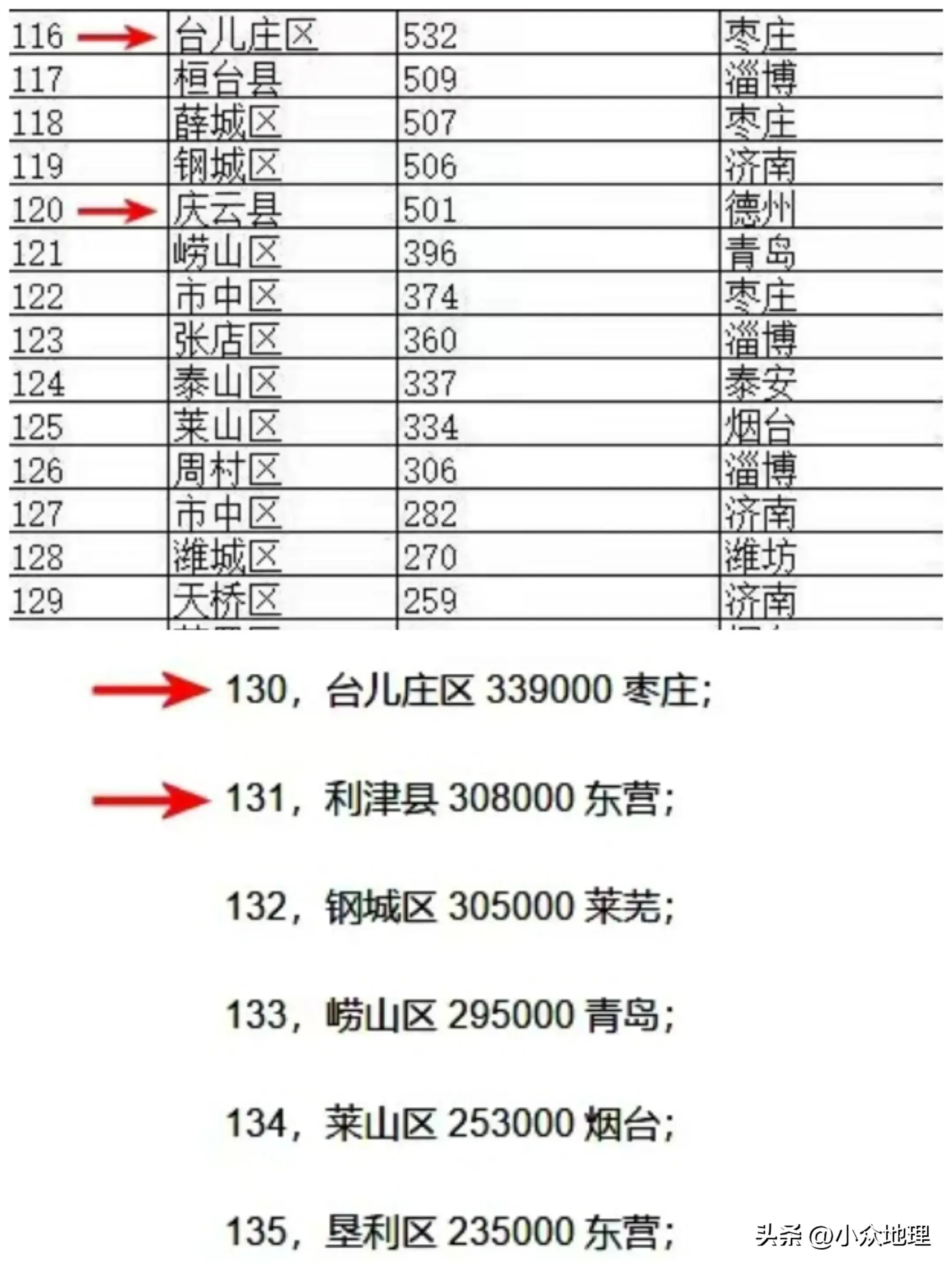 排名倒数后5位的分别是枣庄市山亭区的114亿元、枣庄市台儿庄区的121.5亿元、聊城市东阿县的135.68亿元、滨州市沾化区的139.01亿元、聊城市高唐县的139.83亿元。