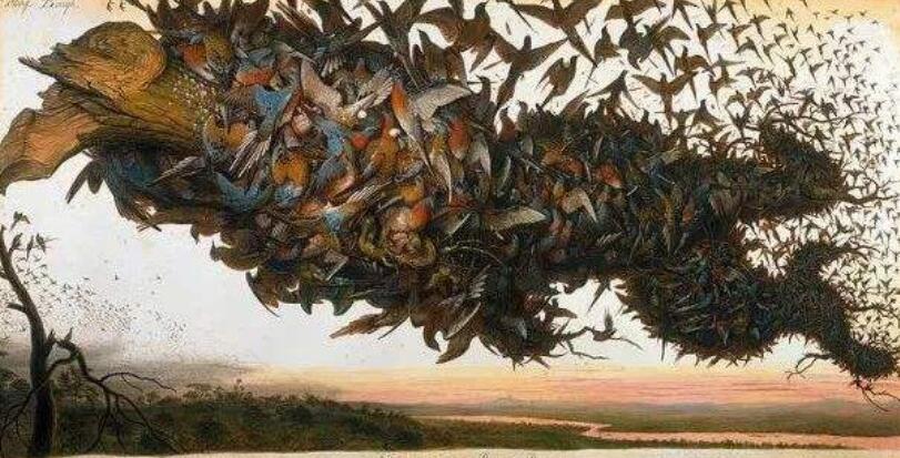 时光倒流,回到了二百多年前的美洲,现在是19世纪初,美国刚刚建立几十年。忽然,天空中出现了一团黑影,是一群快乐的鸟儿,鸟群经过树林的场面非常壮观,简直是铺天盖地。此刻正是正午,鸟群所到之处,天空却显得有些"阴暗"了,就好像日食一样,到处都是这种鸟的影子。鸟群停留在树上休息,大树被压弯了腰,树枝一块块掉落下来。能想象得出吗!这是多么庞大的一个种群!